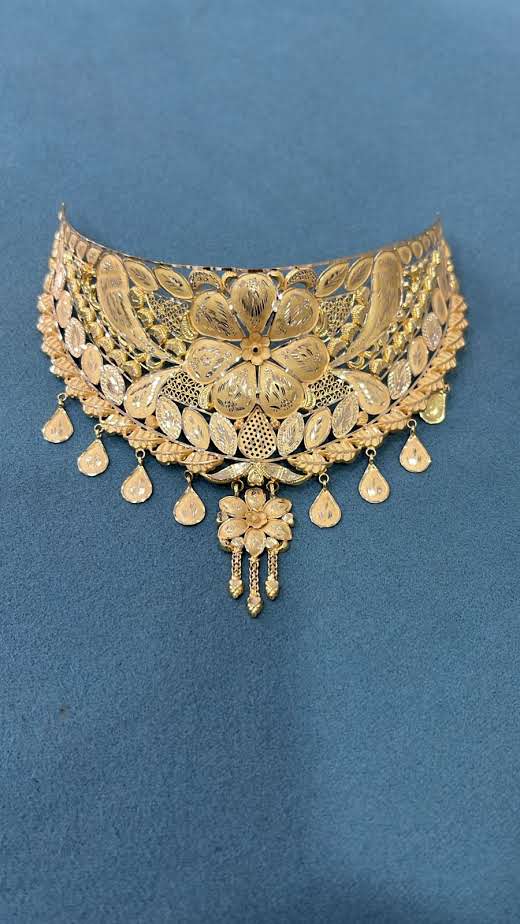 A stunning antique-style choker featuring a large floral centerpiece with intricate gold patterns and hanging bead drops. Ideal for brides and traditional celebrations.