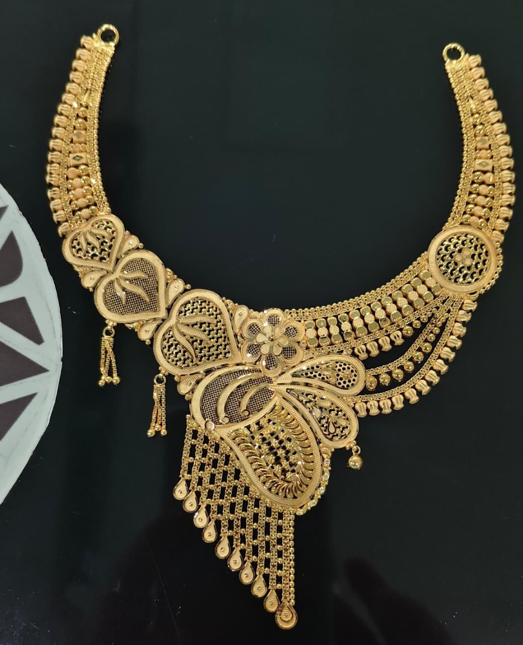 This elaborate gold necklace is designed to impress, featuring multiple layers of beads, filigree detailing, and a prominent floral centerpiece. The lower section showcases cascading teardrop-shaped fringes that add grandeur and movement, making the necklace visually striking. The craftsmanship reflects traditional artistry, blending symmetry with intricate detailing that highlights cultural heritage. Perfect for weddings, festive occasions, and ceremonial wear, this necklace enhances traditional attire with its bold presence. Its timeless design ensures it remains a cherished piece, symbolizing both elegance and cultural pride. This necklace is not just jewelry but a statement of sophistication and heritage.