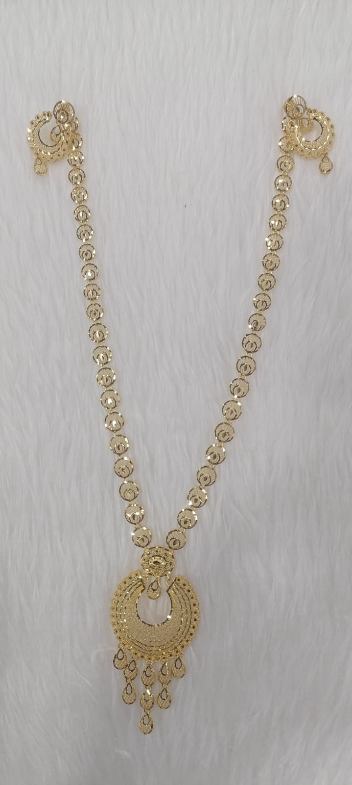 This gold necklace is a stunning example of traditional craftsmanship, featuring a symmetrical chain of circular motifs that lead to a grand central pendant. The pendant is circular with detailed patterns and multiple teardrop-shaped danglers that add charm and movement. The clasp area is also decorated, enhancing the overall aesthetic. Perfect for weddings, cultural ceremonies, and festive occasions, this necklace adds sophistication to traditional attire. Its timeless design ensures it remains a cherished piece, symbolizing both elegance and cultural pride. The craftsmanship highlights durability while maintaining intricate beauty, making it a statement piece for generations.