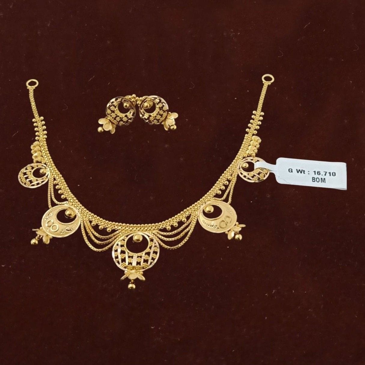 This jewelry set includes a necklace and matching earrings, both featuring circular motifs with lattice patterns and dangling beads. The necklace is adorned with delicate chain work and symmetrical pendants, while the earrings mirror the design. Displayed against a maroon background, the set is marked with “G Wt: 16.710 BOM,” indicating its gold weight. Its craftsmanship and elegance make it suitable for weddings, cultural events, or festive occasions.