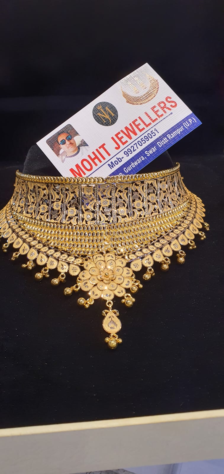 With a bold and structured presence, this broad gold choker showcases intricate texturing across its wide surface. The evenly spaced dangling elements add rhythmic movement and elegance to the design. Weighing approximately 25.330g, it balances substance with comfort. Perfect for weddings, festive celebrations, and traditional ceremonies, this choker frames the neckline beautifully and enhances the richness of ethnic attire.