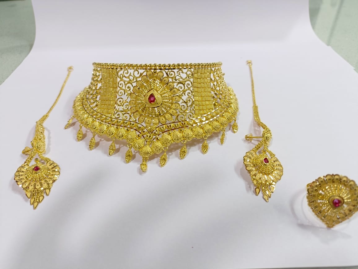 This elegant bridal set includes a beautifully detailed choker necklace complemented by matching earrings and a coordinated ring. The necklace showcases symmetrical temple-inspired motifs with delicate dangling drops along the lower edge. The craftsmanship highlights fine engraving and layered textures that reflect heritage artistry. Ideal for weddings and engagement ceremonies, this coordinated set offers a complete and refined traditional look.