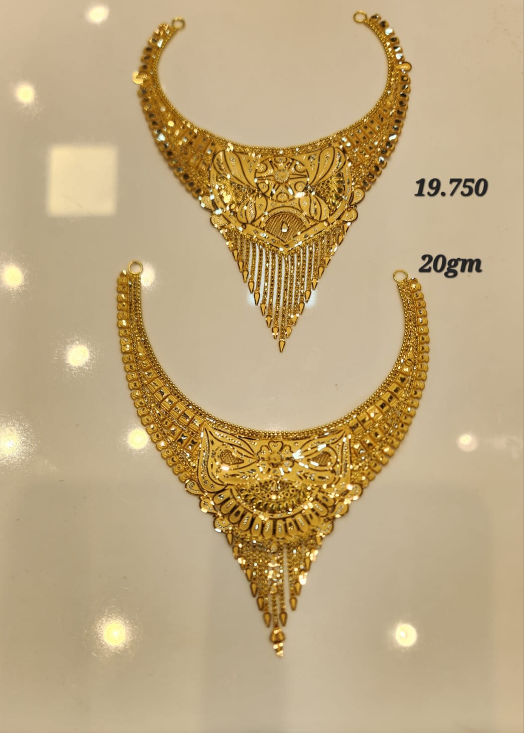 Designed to sit gracefully along the neckline, this classic temple choker showcases dense ornamental motifs arranged in perfect symmetry. The intricate surface texture highlights skilled craftsmanship, while the lower row of dangling drop elements adds rhythm and charm. The coordinating earrings complete the ensemble, making it a perfect choice for brides and festive celebrations. Its bold yet balanced structure ensures a regal and polished appearance.