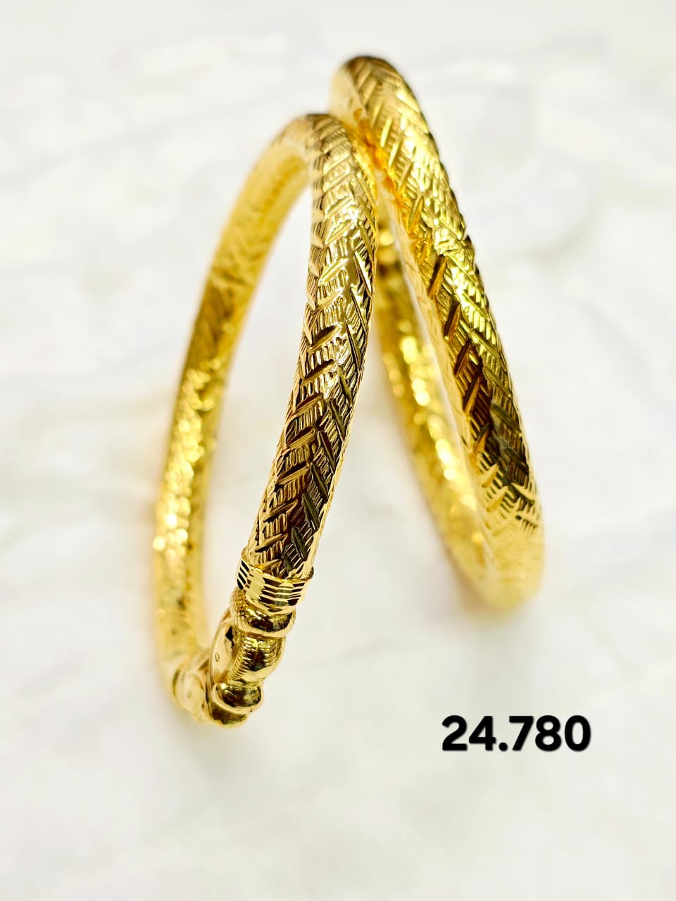 A beautifully designed pair of gold bangles featuring intricate engraved patterns and a rich textured finish. Their timeless traditional design makes them perfect for weddings, festive occasions, and everyday elegance, adding a graceful charm to your jewellery collection.