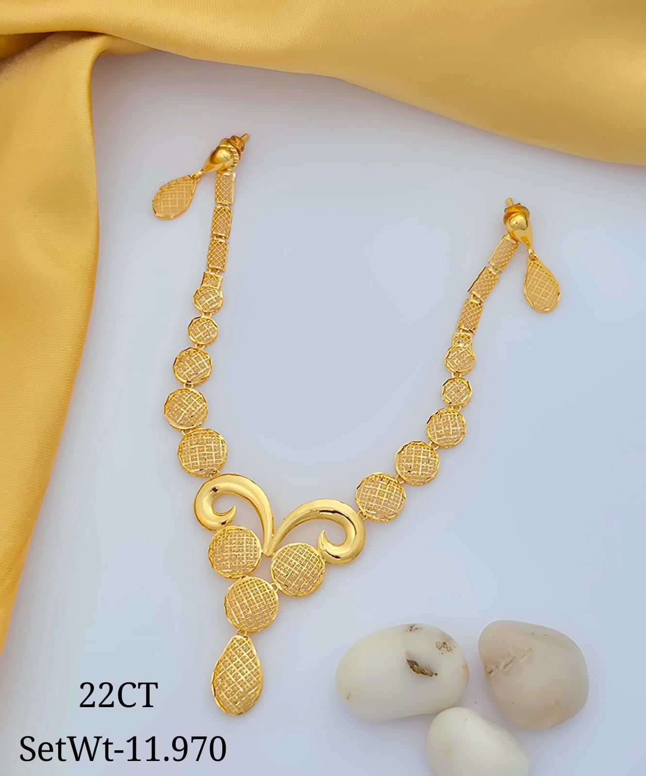 Blending contemporary styling with traditional gold elegance, this necklace features linked circular elements that create a stylish rhythm along the neckline. Lightweight yet eye-catching, it suits both modern attire and traditional outfits.