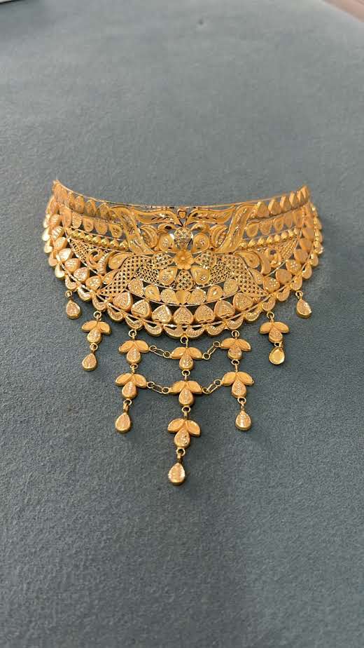 Handcrafted choker with fine filigree detailing and elegant layered patterns finished with stylish gold danglers, perfect for traditional occasions.