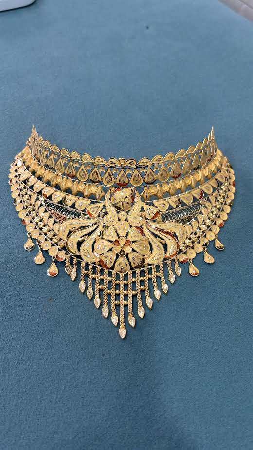 Stylish floral-pattern choker featuring intricate gold craftsmanship and decorative drops, creating a perfect blend of modern elegance and traditional beauty.