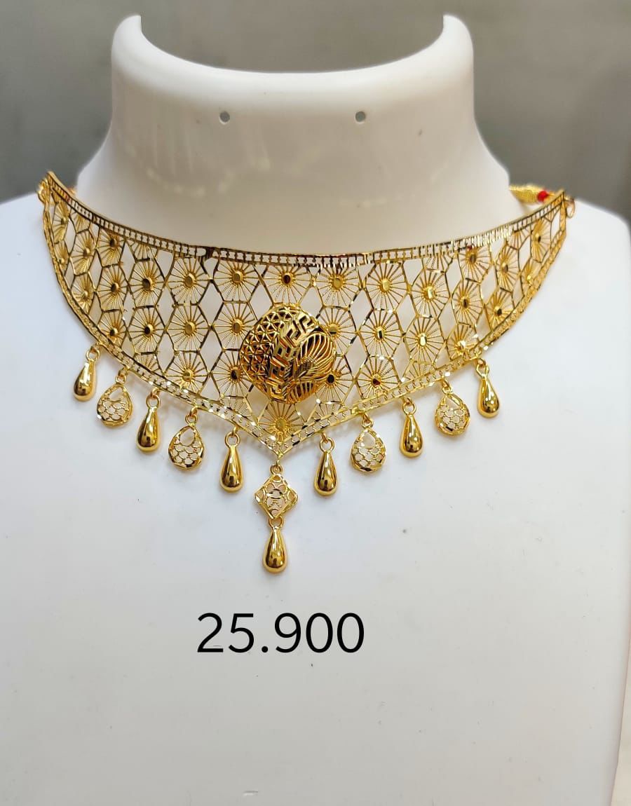 This designer choker blends contemporary styling with traditional floral artistry. The mesh-inspired gold pattern creates a lightweight yet structured foundation, while the floral motifs add softness and elegance. The evenly spaced hanging charms enhance movement and provide a festive finish. Comfortable for extended wear, this piece is perfect for receptions, family gatherings, and celebratory occasions where understated luxury is desired.