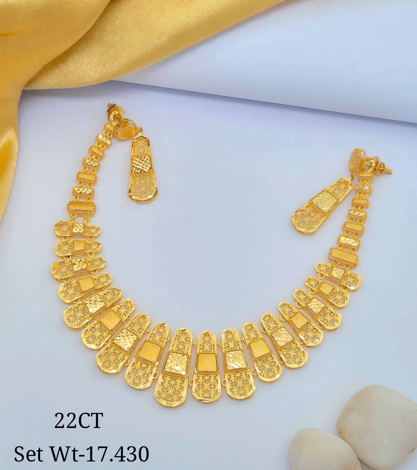 Stylish 22KT gold necklace set crafted with elegant rectangular motifs and intricate textured patterns. The bold and symmetrical design gives it a modern yet traditional appeal, making it perfect for festive occasions, parties, and special celebrations.