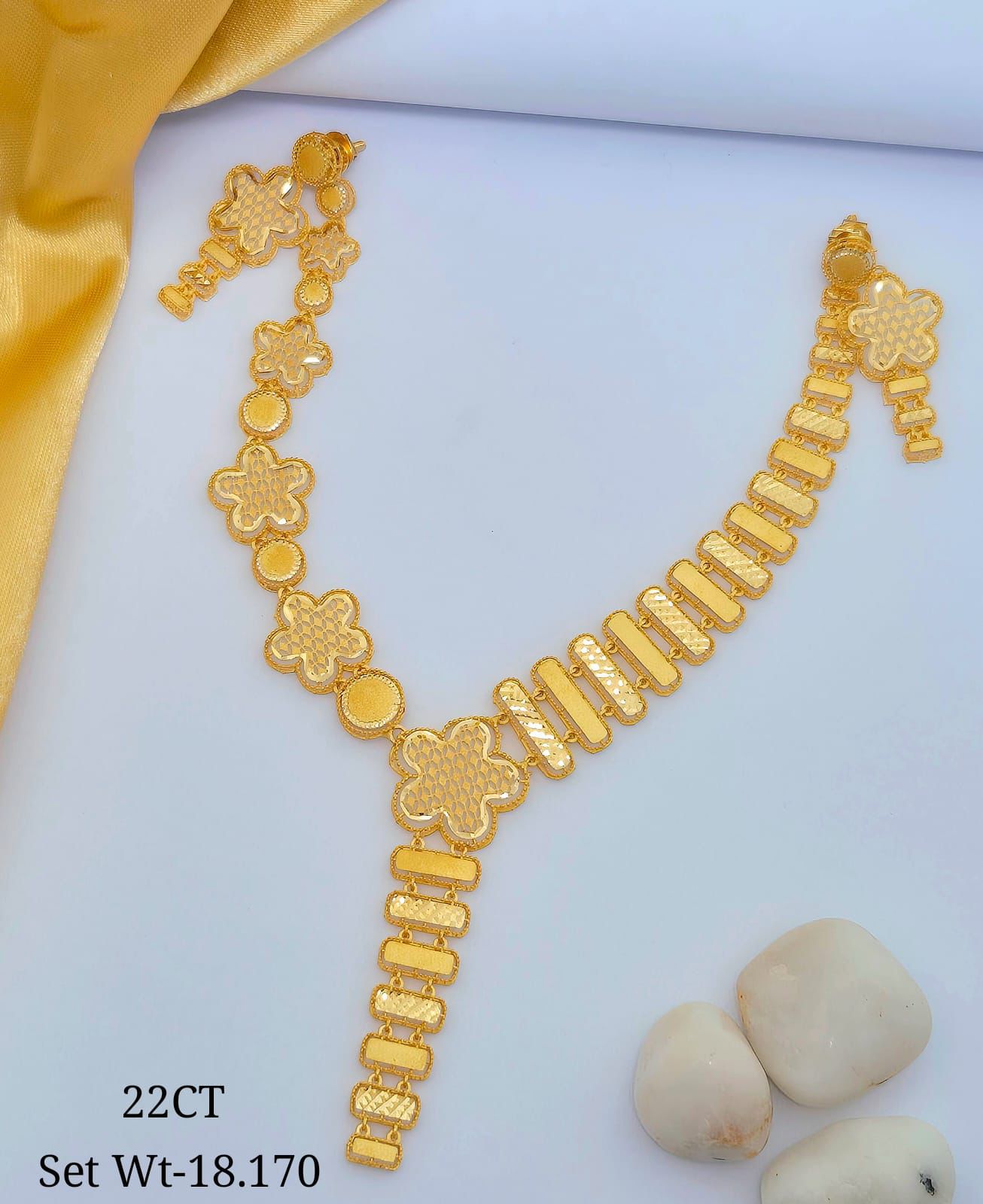 Elegant 22KT gold necklace set featuring beautiful floral motifs combined with stylish rectangular links. The unique asymmetrical design with intricate textures gives it a modern traditional appeal, making it perfect for festive occasions, parties, and special celebrations.