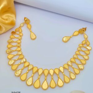 Elegant 22KT gold necklace set crafted with beautiful drop-shaped motifs and fine textured detailing. The symmetrical layered design gives it a graceful and modern traditional look, making it perfect for weddings, festive occasions, and special celebrations.