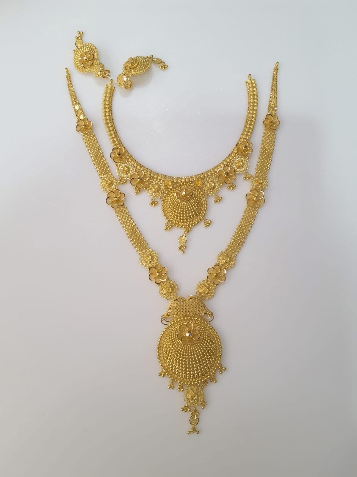 This luxurious gold jewelry set includes a choker-style necklace, a longer necklace, and matching earrings, each crafted with elaborate floral motifs and textured detailing. The choker features a semi-circular pendant that sits gracefully on the neckline, while the longer necklace showcases a grand ornate centerpiece with layered designs. The earrings complement both necklaces, making the set versatile for different occasions. The craftsmanship highlights traditional artistry, blending geometric and floral elements into a cohesive design. Perfect for bridal wear, cultural ceremonies, or festive celebrations, this set is a symbol of opulence and heritage.
