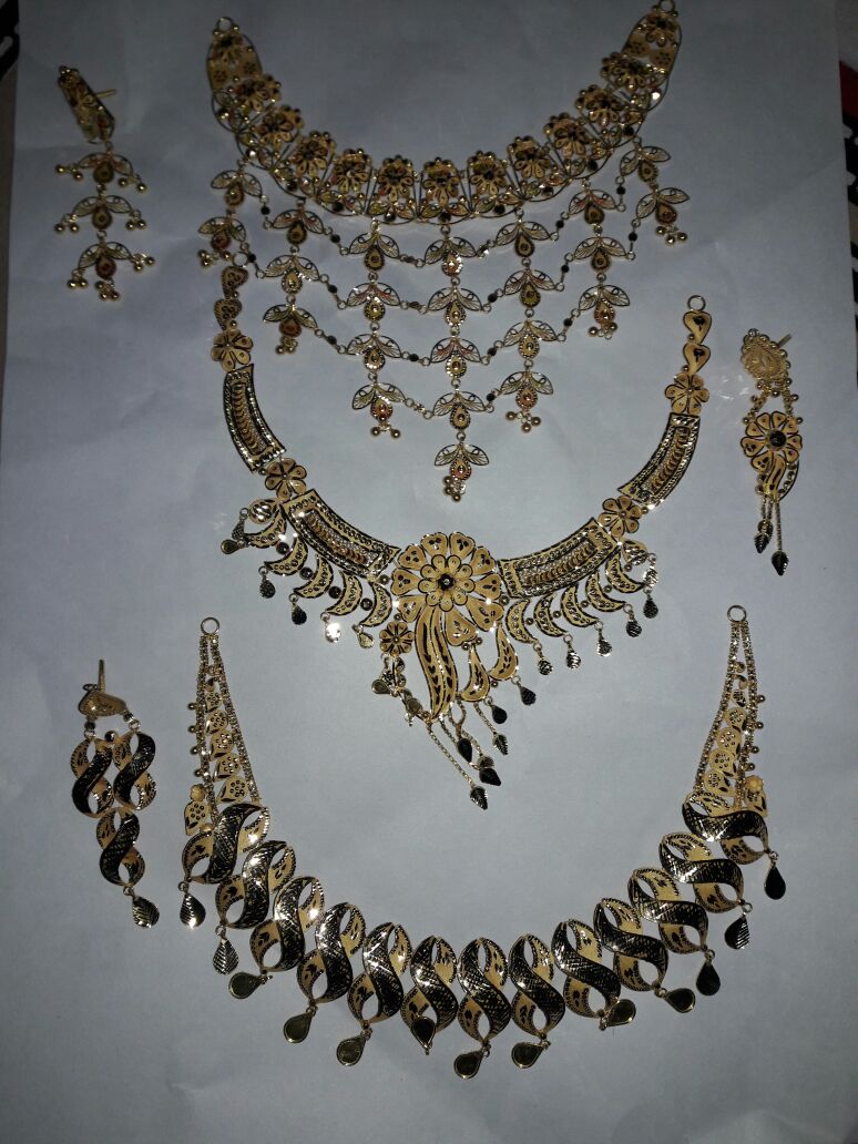 This jewelry collection includes two ornate necklace sets with matching earrings, each showcasing unique motifs and craftsmanship. The upper necklace features floral and teardrop designs with a central pendant, while the lower necklace highlights a crescent-shaped base adorned with circular and layered hanging decorations. The earrings mirror their respective necklaces, creating cohesive sets that exude elegance. Crafted with precision, these pieces reflect traditional artistry and cultural heritage. Perfect for weddings, cultural ceremonies, and festive occasions, this collection offers versatility and sophistication. Each piece is timeless, ensuring it remains a cherished addition to any jewelry collection.