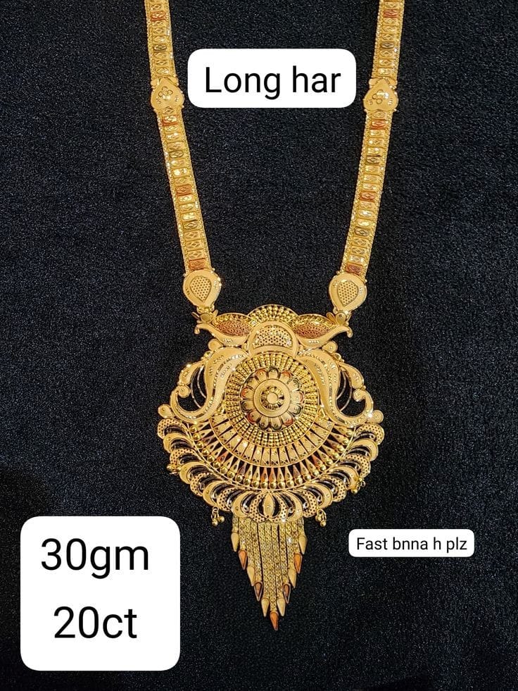 Elevate your traditional jewelry collection with this Elegant Long Haar Temple Gold Necklace, beautifully crafted in 20ct gold and weighing approximately 30 grams. Designed in a classic long haar style, this necklace offers a regal silhouette that enhances any ethnic attire.