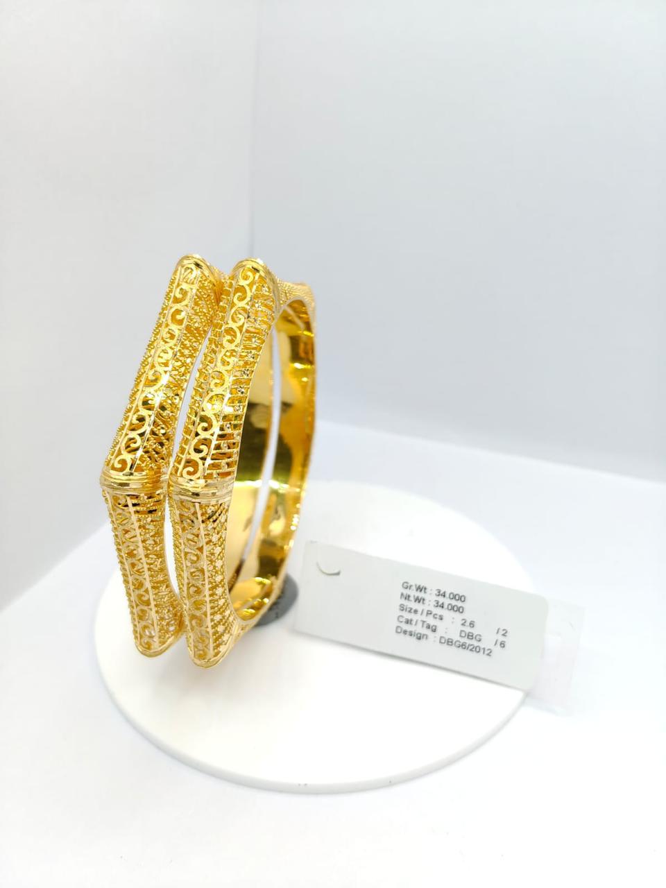 These gold bangles are a refined example of traditional jewelry artistry, featuring detailed filigree work with symmetrical patterns that highlight balance and elegance. The polished finish enhances the brilliance of the gold, while the intricate designs reflect cultural heritage and timeless craftsmanship. Displayed on a white stand with “34.000” inscribed, the bangles emphasize both their luxurious weight and ornamental value. Their versatile design makes them suitable for weddings, festive occasions, or cultural events, complementing both traditional and modern attire. These bangles embody sophistication, tradition, and artistry, making them a treasured accessory for anyone seeking elegance and cultural charm.