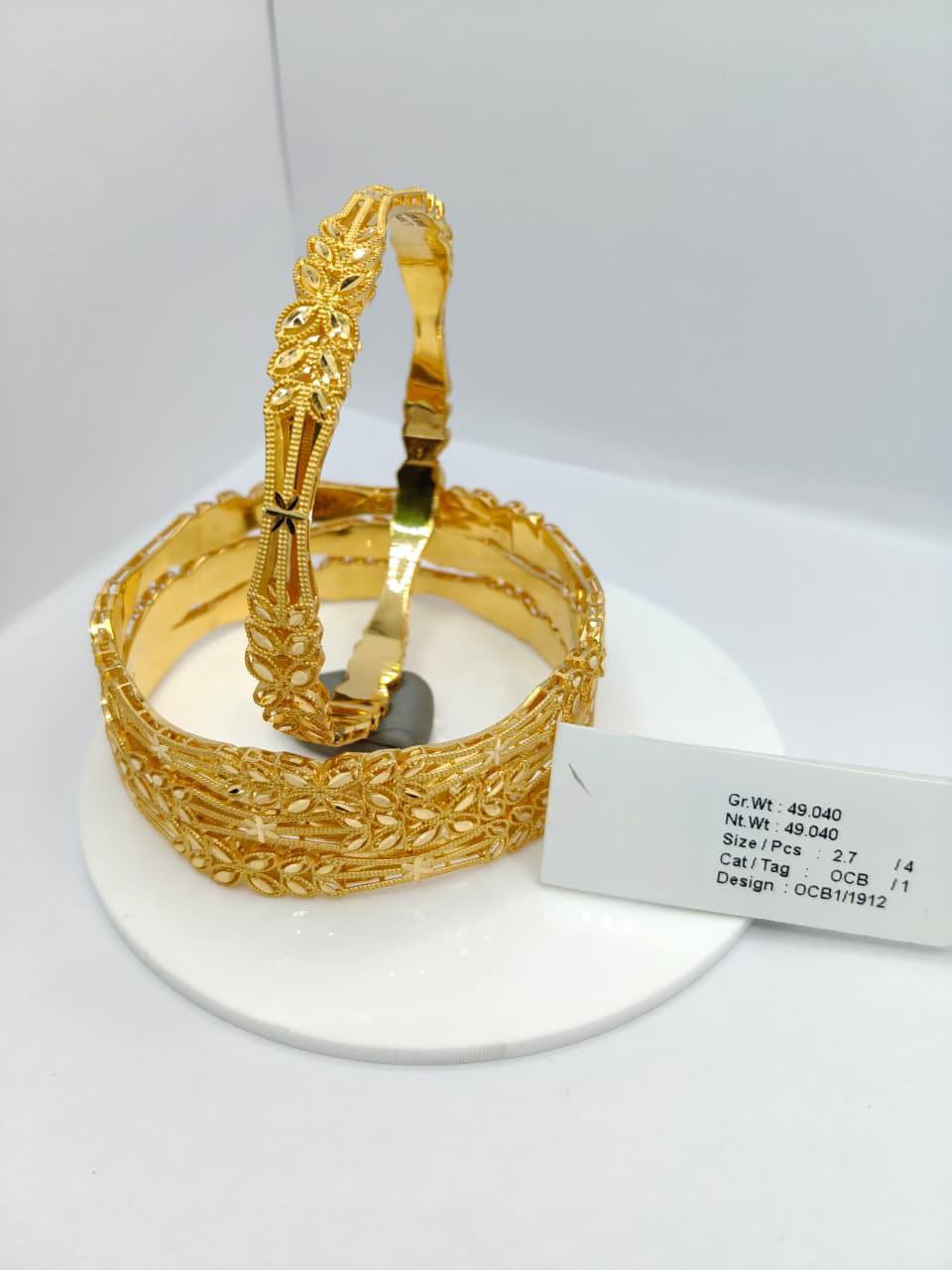 These gold bangles are a stunning example of traditional artistry, featuring a blend of floral and geometric motifs arranged with precision and symmetry. The detailed engravings highlight fine craftsmanship, while the polished finish enhances the brilliance of the gold. Displayed on a white circular stand with “49.040” inscribed, the set emphasizes both its luxurious weight and ornamental value. Their versatile design makes them suitable for weddings, festive occasions, or cultural events, complementing both traditional and modern attire. These bangles embody timeless elegance, cultural heritage, and sophistication, making them a treasured accessory for any jewelry collection.