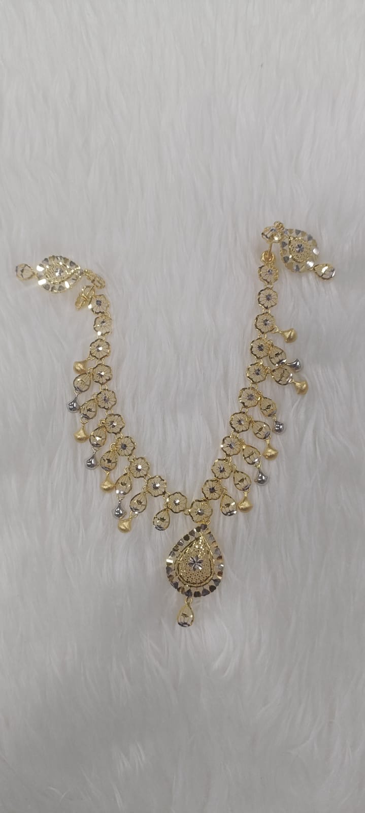 This intricately designed gold necklace features alternating floral motifs with gold and silver-toned accents, creating a striking contrast. The centerpiece is a large teardrop-shaped pendant adorned with a star-like design and detailed engravings, finished with a dangling bead that adds movement. The craftsmanship highlights precision and cultural artistry, making this necklace ideal for weddings, festive occasions, and ceremonial wear. Its timeless design ensures it remains a cherished piece, symbolizing both tradition and sophistication. This necklace is not just jewelry but a statement of elegance and cultural pride.