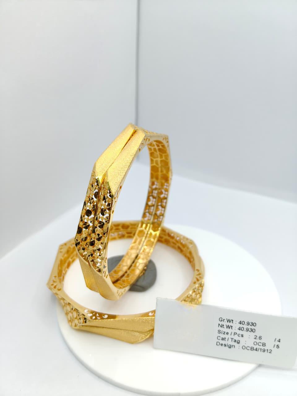 These gold bangles are a striking example of traditional jewelry design, featuring intricate geometric and lattice patterns that highlight balance and symmetry. The combination of matte and polished finishes creates a beautiful contrast, enhancing the overall elegance and sophistication of the piece. Displayed on a white stand with “40.930” inscribed, the bangles emphasize both their substantial weight and luxurious appeal. Their detailed craftsmanship reflects cultural artistry and timeless tradition, making them suitable for weddings, festive occasions, or ceremonial wear. These bangles embody heritage, refinement, and luxury, serving as a versatile accessory for both traditional and modern attire.
