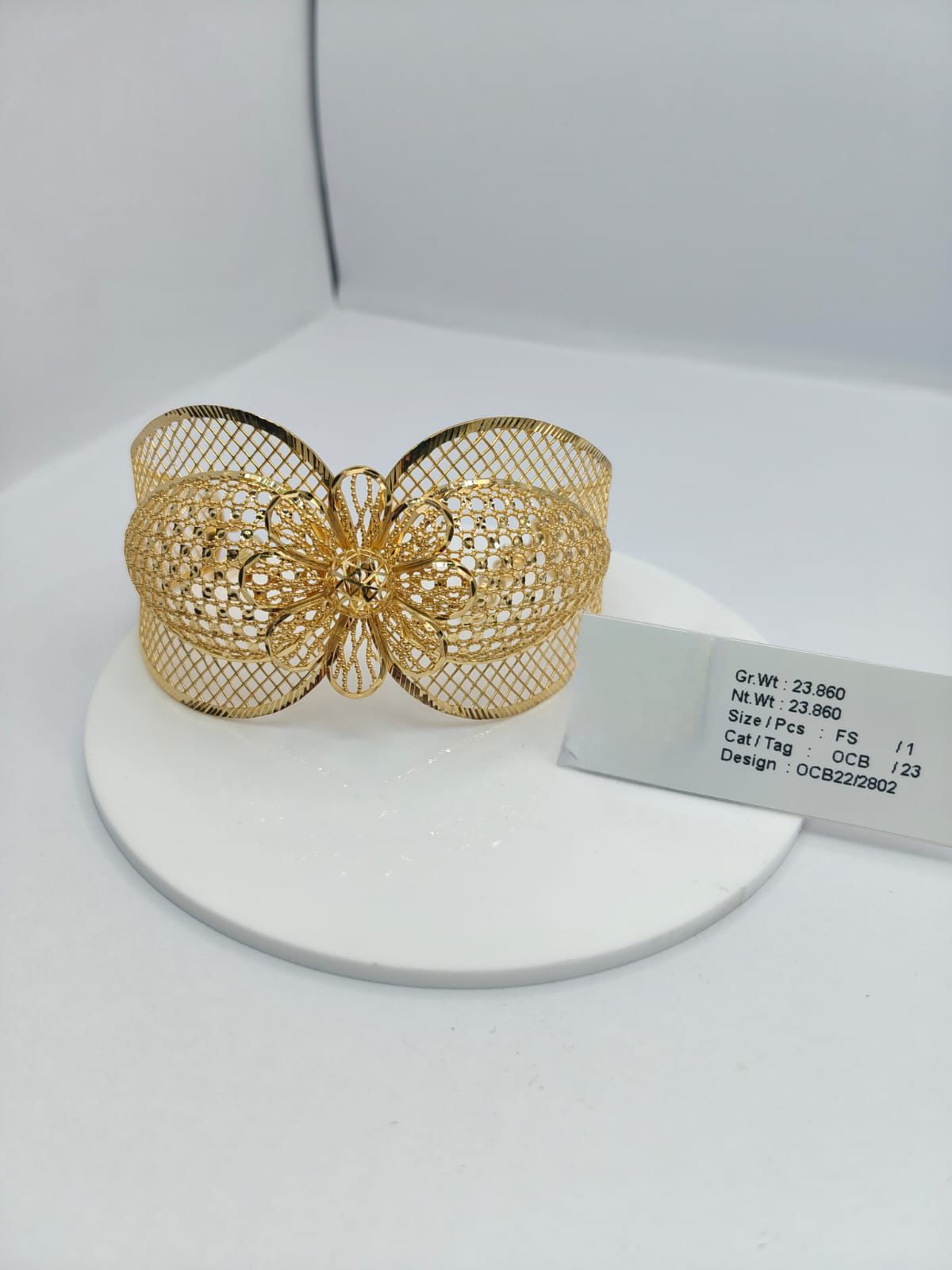 Elegant 22KT gold designer kada featuring a beautiful floral centerpiece with intricate mesh and filigree detailing. The wide cuff-style design gives it a bold and luxurious look, making it perfect for weddings, festive occasions, and traditional wear. A statement piece that blends classic craftsmanship with royal elegance.
