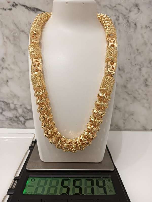 Premium 22KT gold heavy designer chain featuring intricate hollow bead craftsmanship with detailed textured cylindrical segments. The bold and luxurious design gives it a rich royal look, making it perfect for weddings, grand occasions, and statement styling. A magnificent jewellery piece that showcases fine craftsmanship and timeless elegance.