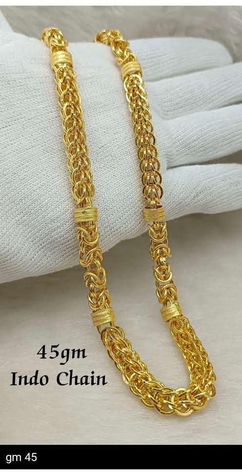 Elegant 22KT gold Indo-style designer chain featuring an intricate braided link pattern with beautifully crafted textured cylindrical accents. The rich and stylish design gives it a premium traditional look, making it perfect for weddings, festive occasions, and statement styling. A timeless jewellery piece that reflects fine craftsmanship and luxury.