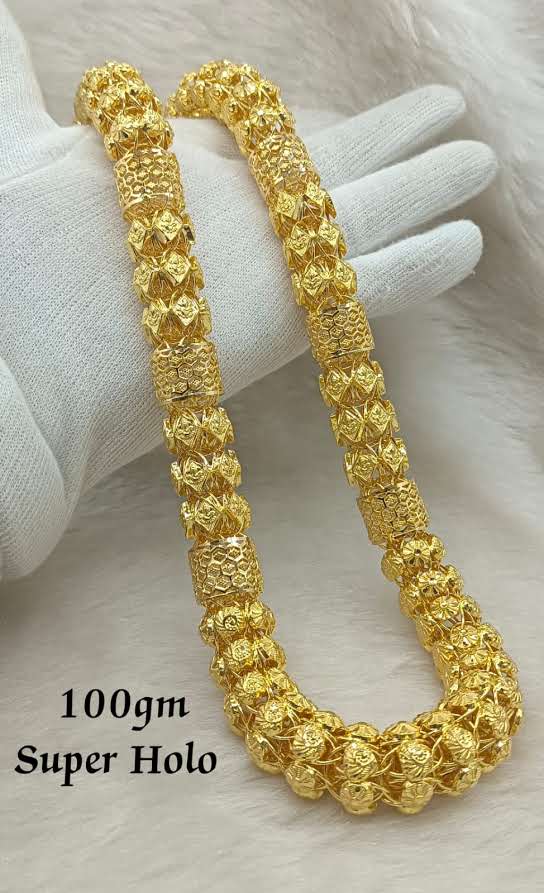 Elegant 22KT gold Super Holo designer chain featuring beautifully crafted textured beads and intricate cylindrical pattern segments that create a rich and luxurious appearance. The bold yet refined design gives it a royal traditional touch, making it ideal for weddings, festive occasions, and premium statement styling. A finely crafted jewellery piece that reflects timeless elegance and superior craftsmanship.