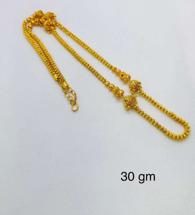 Elegant 22KT gold long chain featuring intricate bead work and beautifully crafted designer bead accents in the center. The traditional detailing and rich finish make it perfect for weddings, festive occasions, and ethnic outfits. A timeless jewellery piece that adds elegance and charm to any look.