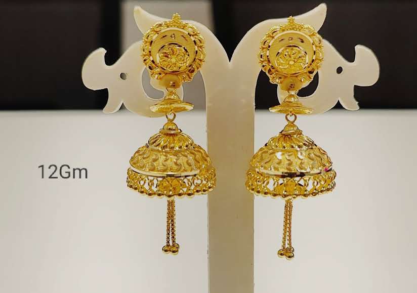 Classic 22KT gold jhumka earrings designed with detailed floral studs and beautifully crafted dome-shaped jhumka drops with delicate hanging chains. Perfect for festive occasions, weddings, and traditional outfits, adding timeless elegance to your jewellery collection.