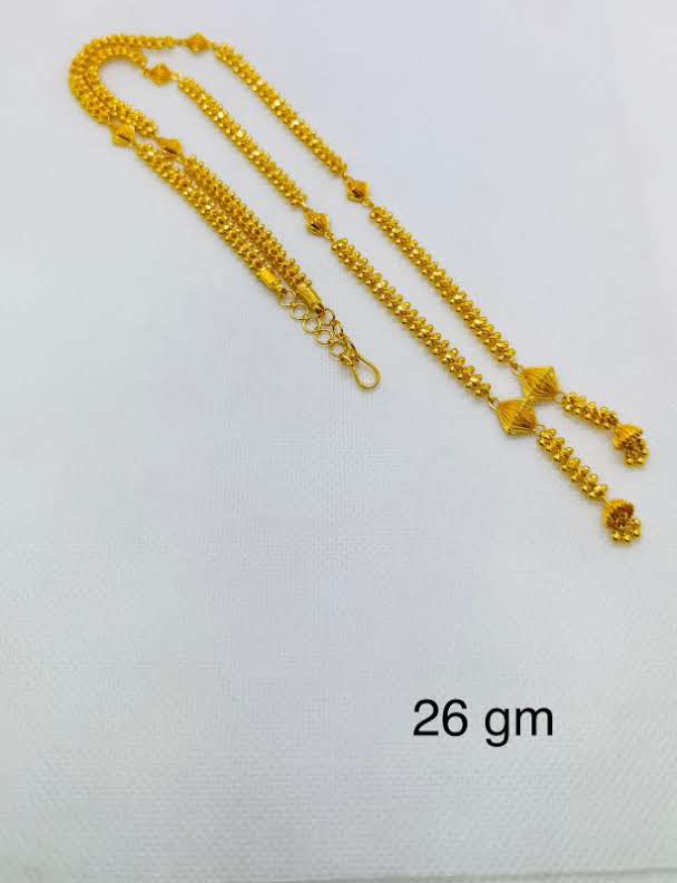 Beautiful 22KT gold traditional long chain featuring elegant bead detailing and a stylish geometric centerpiece with hanging tassels. The rich craftsmanship and classic design make it perfect for weddings, festive occasions, and traditional outfits. A graceful jewellery piece that adds timeless charm and elegance.