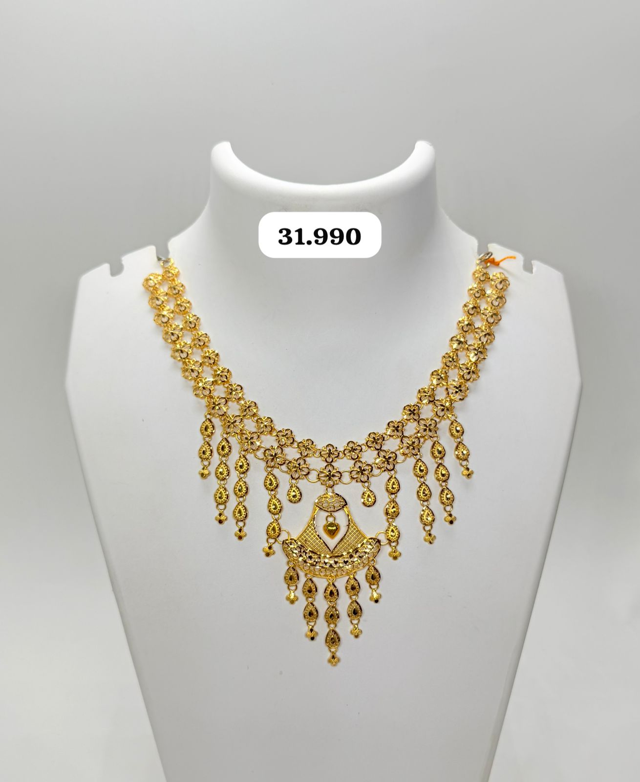 An elegant gold necklace designed with intricate floral patterns and delicate drop danglers that create a graceful traditional look. Crafted with fine detailing and a beautiful central pendant, this necklace is perfect for weddings, festive occasions, and special celebrations, adding a touch of royal elegance to any outfit.
