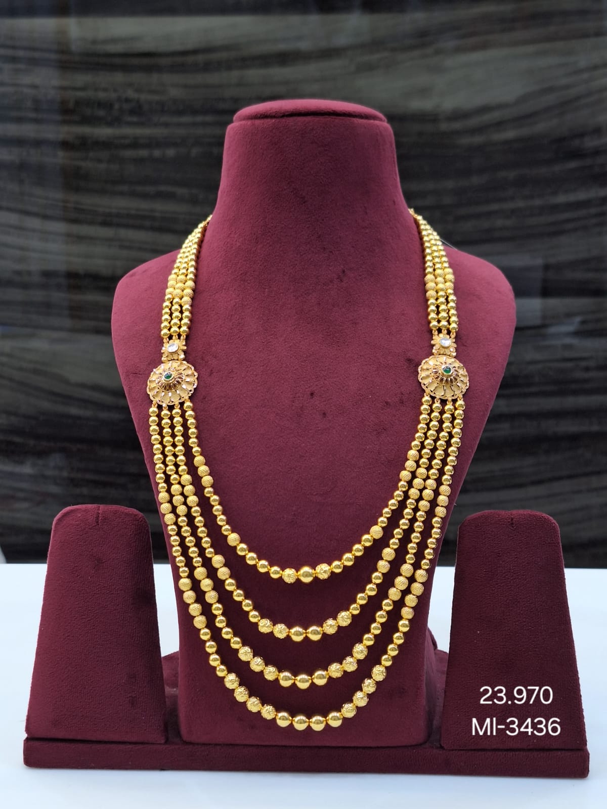 This necklace features five strands of uniformly sized spherical gold beads arranged in a cascading pattern. Two decorative floral-shaped gold elements with embedded green gemstones accentuate the design. Displayed on a maroon velvet stand, the necklace exudes elegance and tradition. Its multi-layered structure makes it a statement piece for weddings or cultural events. The craftsmanship highlights balance, symmetry, and luxurious artistry, making it a treasured accessory for ceremonial wear.