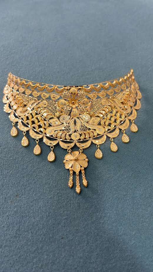A stunning choker featuring peacock-inspired motifs and delicate gold drops that reflect traditional heritage craftsmanship.
