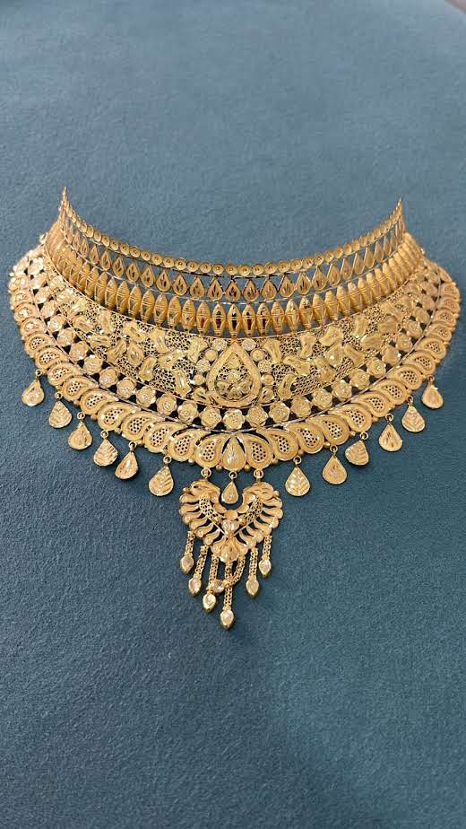 A heritage-inspired choker featuring intricate peacock and floral designs with detailed craftsmanship and hanging gold drops, giving a regal traditional look.