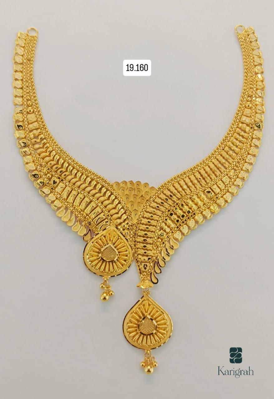 This ornate gold necklace is designed around a majestic peacock motif, a symbol of beauty and grace in traditional artistry. The central pendant showcases the peacock surrounded by elaborate floral and geometric patterns, enhanced by multiple layers of gold beads and chains. The craftsmanship reflects cultural heritage, blending symmetry with intricate detailing that makes the necklace visually striking. Ideal for ceremonial wear, weddings, and festive occasions, this piece adds grandeur to traditional attire. Its design celebrates heritage while offering timeless elegance, making it a treasured addition to any jewelry collection.