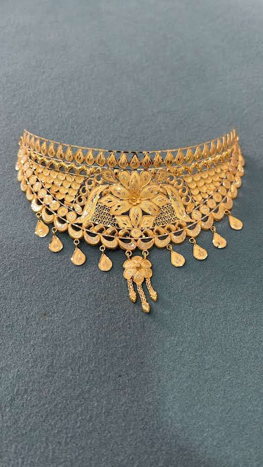 Beautiful lotus-inspired choker crafted with detailed floral carvings and elegant drop elements that enhance the royal bridal look.