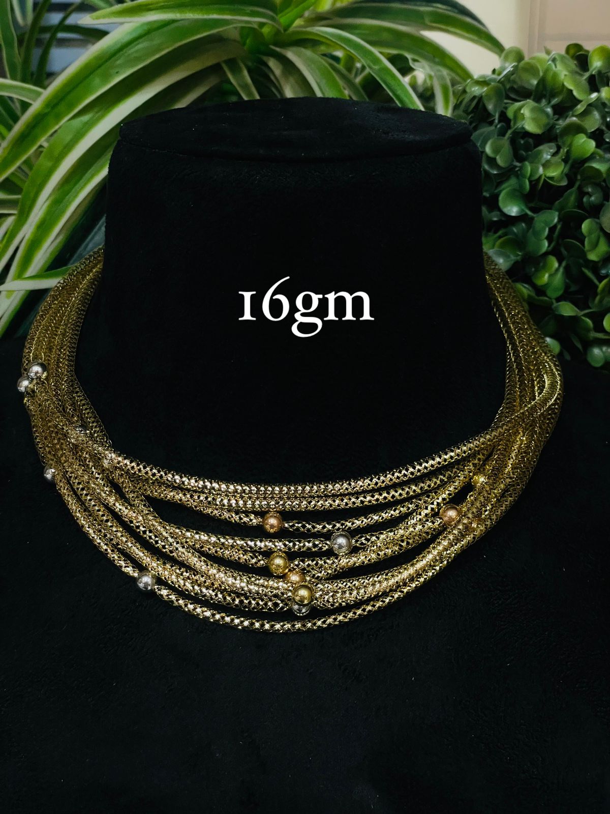 A stunning multi-layer gold necklace designed with intricate mesh chains and elegant gold beads. Its rich layered design creates a bold and luxurious look, making it a perfect statement piece for weddings, parties, and festive occasions.
