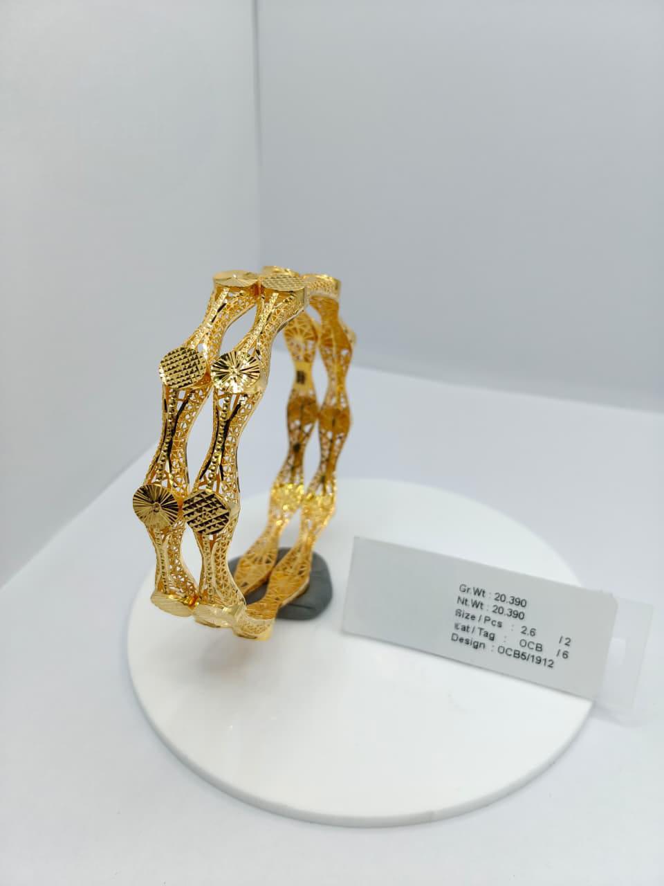 This pair of gold bangles features a unique openwork design with alternating textured and starburst motifs, giving them a luxurious and eye-catching appearance. The intricate detailing reflects fine craftsmanship and cultural artistry, while the polished finish enhances their brilliance. Displayed on a white circular stand with “20.390” inscribed, the bangles highlight both their ornamental value and lightweight elegance. Perfect for weddings, ceremonial wear, or festive occasions, they embody timeless tradition and sophistication. Their distinctive starburst motifs add a touch of uniqueness, making them a treasured accessory for those who appreciate artistry and heritage.