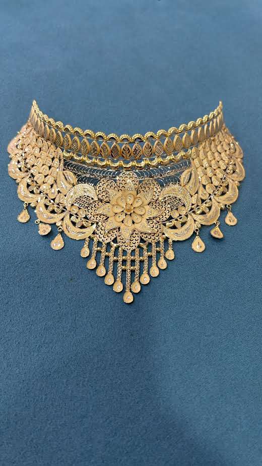 Beautiful handcrafted choker showcasing fine filigree work with classic layered patterns and delicate gold charms. A graceful piece perfect for festive and cultural events.