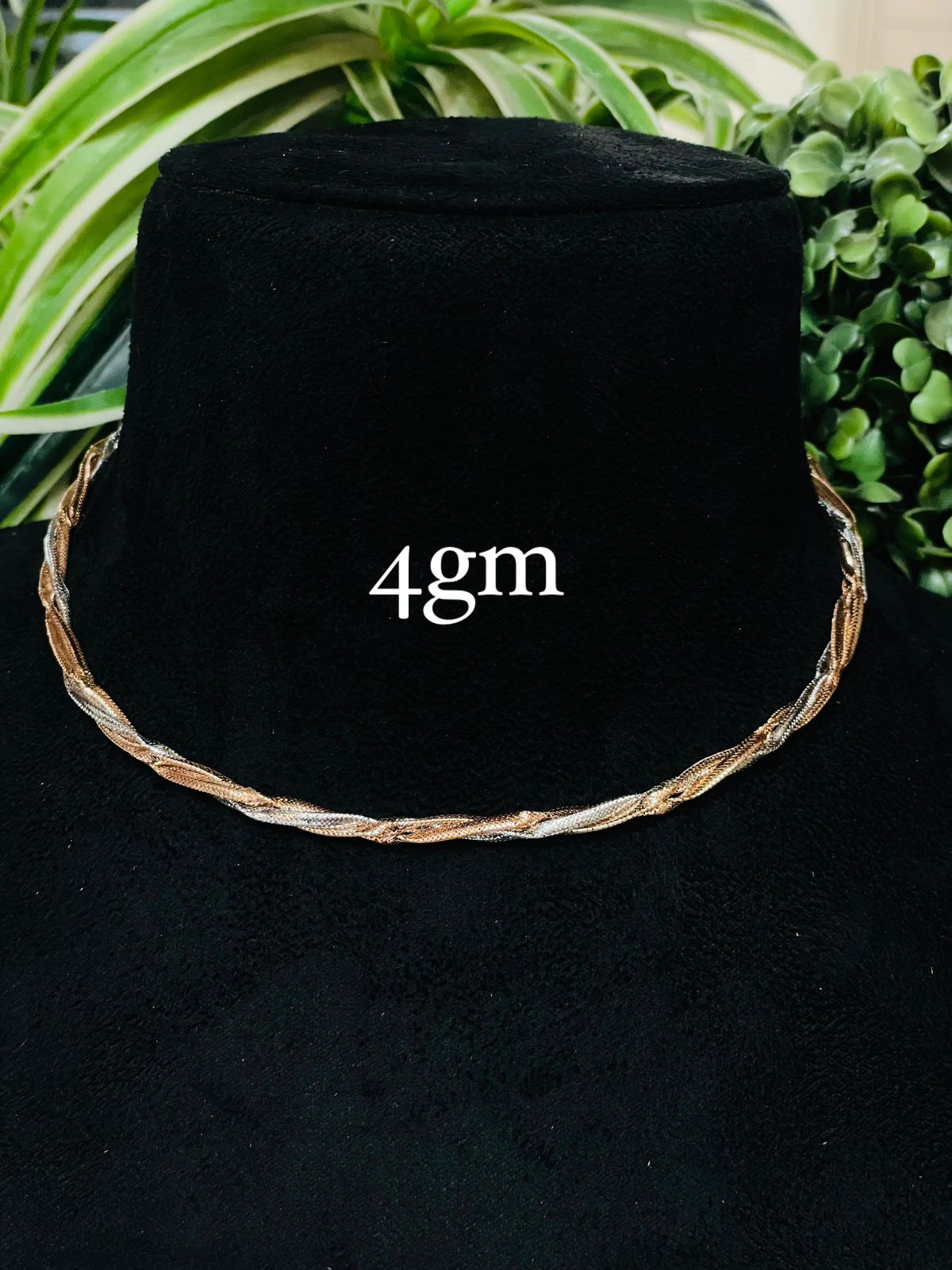 A beautifully crafted twisted chain featuring a stylish tri-tone finish that blends gold and white tones for a modern look. Its elegant twist pattern and refined shine make it perfect for daily wear or special occasions, adding a touch of sophistication to any outfit.